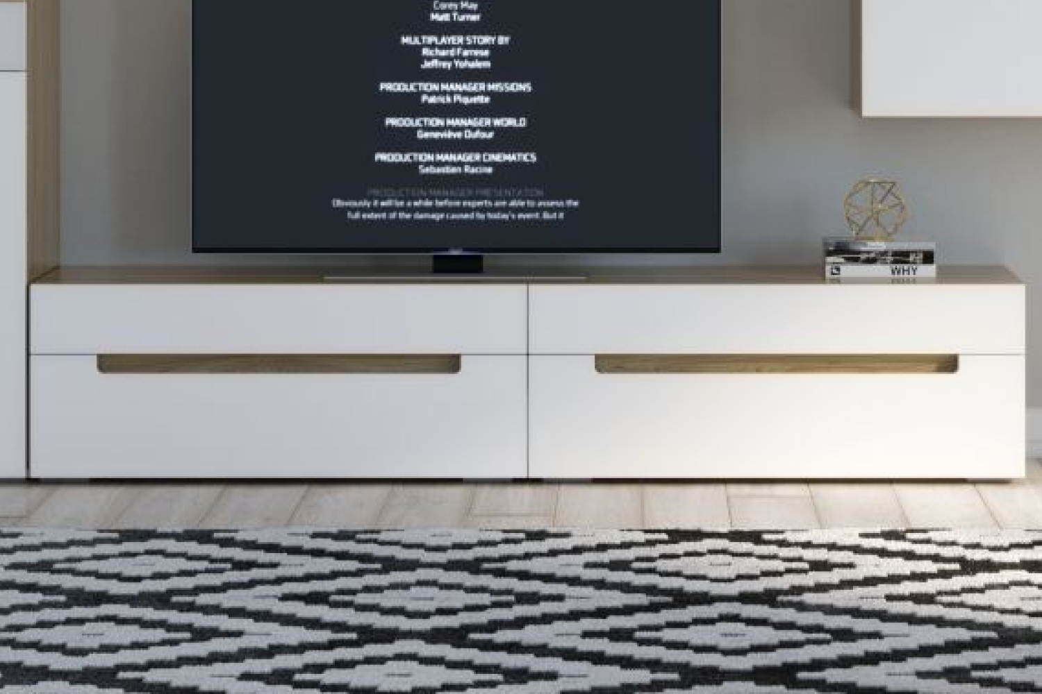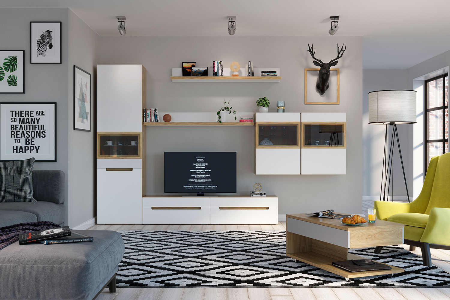 Гарнитур состоит из напольного двустворчатого шкафа-пенала, двух навесных шкафов, компактной низкой ТВ-тумбы и двух лаконичных полочек. Надежные крепеж и фурнитура гарантируют длительный срок службы меблировки. Система скрытых направляющих поможет задействовать весь внутренний объем ящиков и обеспечит качественную фиксацию мебельных элементов. Демпферы и доводчики сделают эксплуатацию гостиной удобной и приятной.