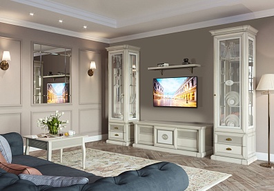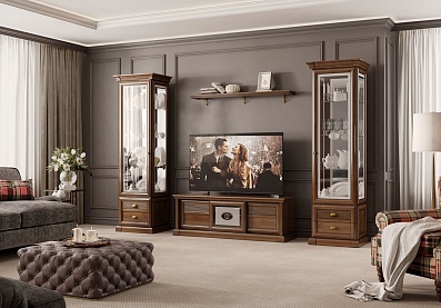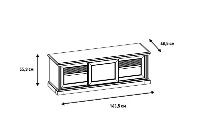 • Крайние секции — выдвижные ящики, средняя секция с двумя отделениями по высоте (верхнее отделение — открытая ниша, нижнее отделение — с выдвижным ящиком);