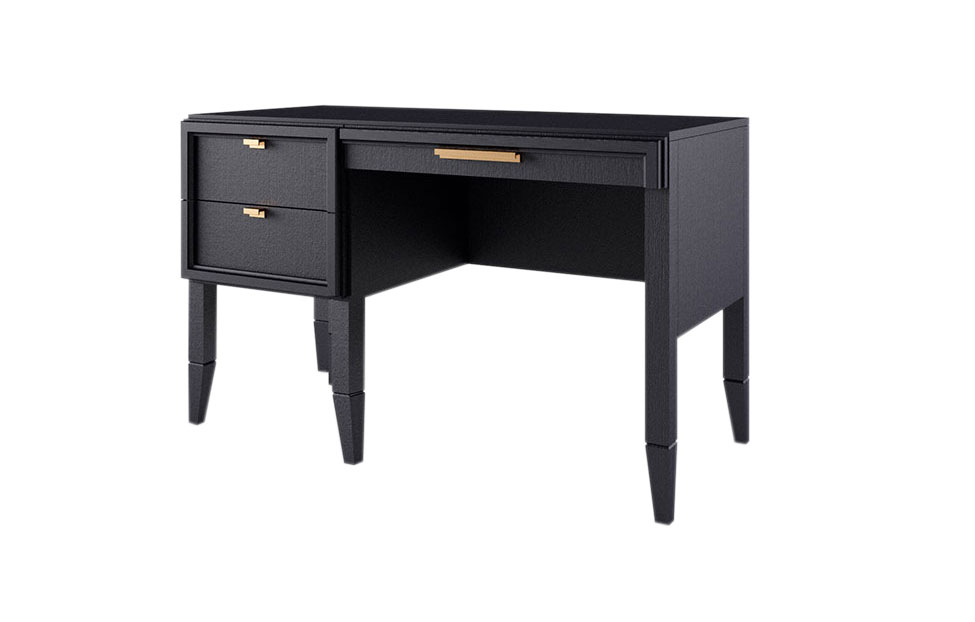 • Стол письменный однотумбовый — с двумя крайними выдвижными ящиками и одним центральным выдвижным ящиком.