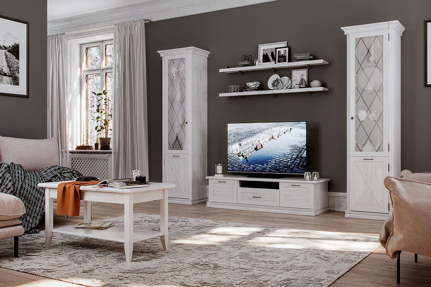 Гостиная состоит из двух шкафов-витрин, компактной ТВ-тумбы с тремя вместительными отделениями и двух полок. Композицию обрамляют колонны — их также можно установить в середине между модулями. Мебельные механизмы оснащены демпферами для плавного и бесшумного закрывания. Скрытые направляющие позволяют максимально задействовать внутреннее пространство и обеспечить надежную фиксацию выдвижных ящиков.