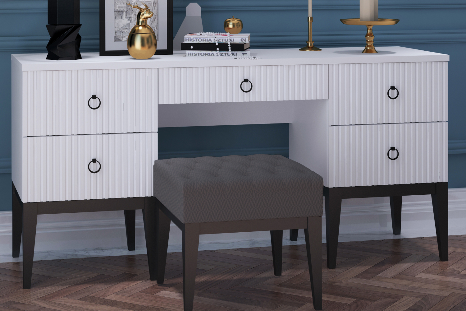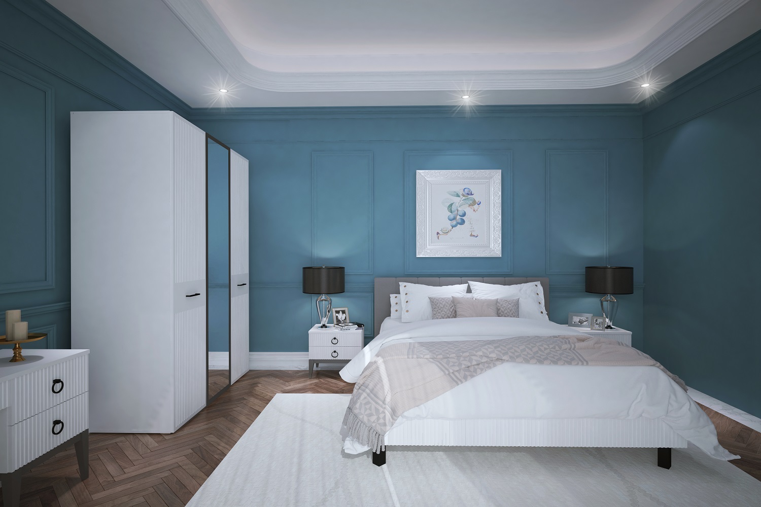 Комплект состоит из трехстворчатого шкафа, кровати с мягким изголовьем, двух небольших тумб и стола с пятью выдвижными ящиками, который с легкостью заменит привычный туалетный столик. Высокие скошенные опоры из массива бука облегчат уборку, а настенное зеркало и зеркальная вставка системы хранения помогут в процессе сборов. Корпусная часть меблировки изготовлена из ЛДСП, а фасады — из МДФ, окутанной ПВХ-пленкой оттенка «белый премиум». Модульность гарнитура предполагает возможность выбора мебельных изделий по размерам и функционалу.